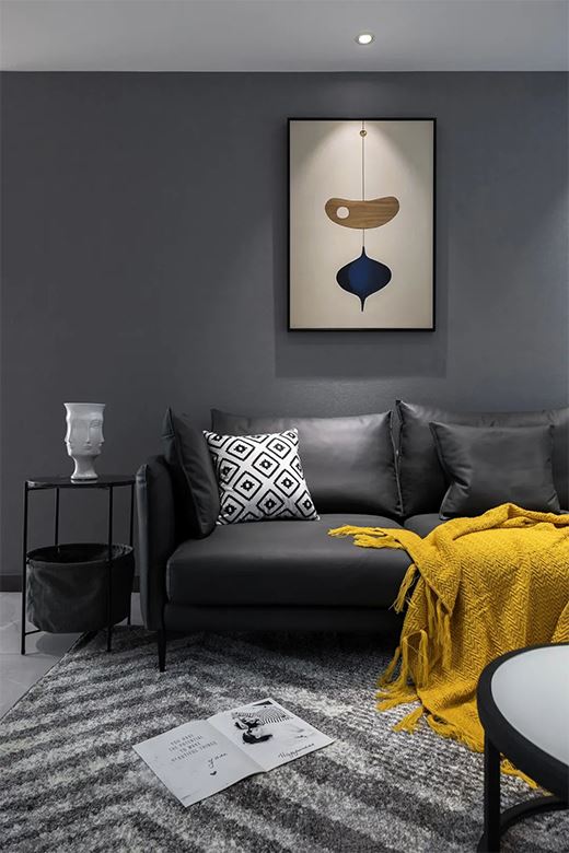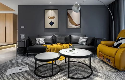 ▲深灰色沙發墻,掛上兩幅抽象裝飾畫,擺上深灰色布藝沙發、兩張圓形的石材茶幾組合,邊上一盞落地燈,使得空間充滿低調高級的氛圍感。