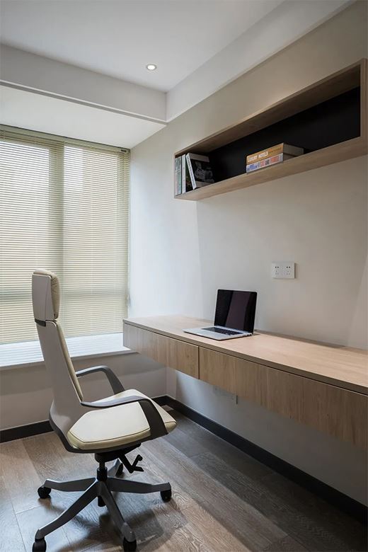 ▲書房裝上懸空書桌與書架,擺上一張休閑辦公椅,還有飄窗與百葉簾的設計,為主人打造了一個實用舒適的書房區域。