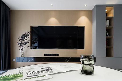 ▲電視墻以木飾面的定制,中間留空電視機的壁掛安裝位置,裝上黑色懸空的電視柜,右側是灰色的收納柜+書架展示架,整個電視墻給人一種現代簡約而實用的高級效果。
