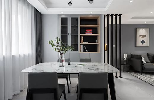 ▲餐廳左側是廚房門,右側定制一個入墻式的餐邊柜,中間擺上黑白配的餐桌+灰色皮藝餐椅,簡潔時尚與現代的氛圍格調充滿了整個餐廳空間。