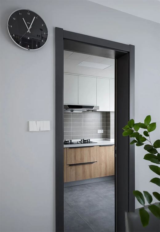 ▲廚房門口旁邊的墻面掛著一個黑色的時鐘,在現代簡潔的餐廳空間下,呈現出一種自然舒適的高級設計感。