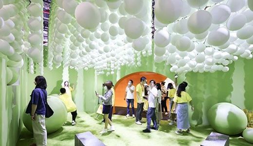 而在“互動創作區”,觀展者可以暢游解壓宇宙,用飛鏢擊落包裹乳膠漆的氣球,共同構建這個空間內的“藝術盛舉”。