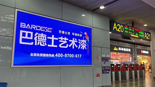 11月1日起,巴德士藝術漆高鐵、機場廣告強勢啟動。醒目的巴德士藝術漆廣告牌在廣州南站的候車大廳等多個乘客必經之地全方位覆蓋。
