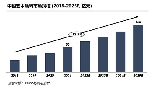 2020年疫情前,在整體建材行業蓬勃發展的背景下,藝術涂料行業的年復合增長率約為30%;由于后續受疫情和地產行業暴雷的影響,行業整體增速放緩,年復合增長率維持在15%左右。2021年中國藝術涂料市場容量達到53億元左右,同比增速超30%,遠高于行業增長速度,成為行業增速最快的品類。對比目前藝術涂料滲透率能達到40%以上的歐美成熟市場,面對市場規模千億級的國內裝飾涂料行業,目前國內藝術涂料滲透率僅達10%。未來5-10年,藝術涂料市場滲透率至少還有30%的上升空間,預計到2025年,藝術涂料的市場規模將達到100億元左右,市場前景廣闊。