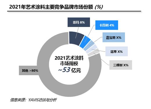 面對內墻乳膠漆、木器漆等傳統產品增長紅利殆盡,高利潤以及高增長潛力藝術涂料的出現使得眾多品牌紛紛進場,藝術涂料成為眾多品牌保持利潤持續增長的機會點。從競爭格局來看,除了菲瑪、卡百利、威羅、寇蒂等專業化藝術涂料品牌入局外,嘉寶莉、三棵樹、巴德士、展辰、美涂士、大寶漆、立邦、宣偉華潤、紫荊花等知名傳統涂料品牌也開始布局該賽道。