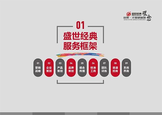 盛世經(jīng)典,16年的品牌歷練,豐富的招商操盤、品牌策劃、渠道實戰(zhàn)經(jīng)驗,目前已累計打造出1000+家經(jīng)典案例,幫助數(shù)百家企業(yè)品牌走向騰飛之路,并憑借著出色的品牌解決方案以及無微不至的服務(wù)精神,獲得廣大客戶、行業(yè)組織、政府機構(gòu)的絕對認可!我們承諾不做無效策劃,始終堅持以最快、最好的服務(wù)來幫助企業(yè)實現(xiàn)快速突圍,助力品牌騰飛!