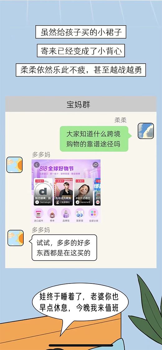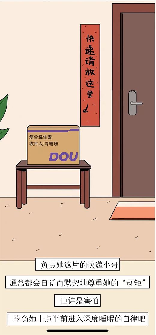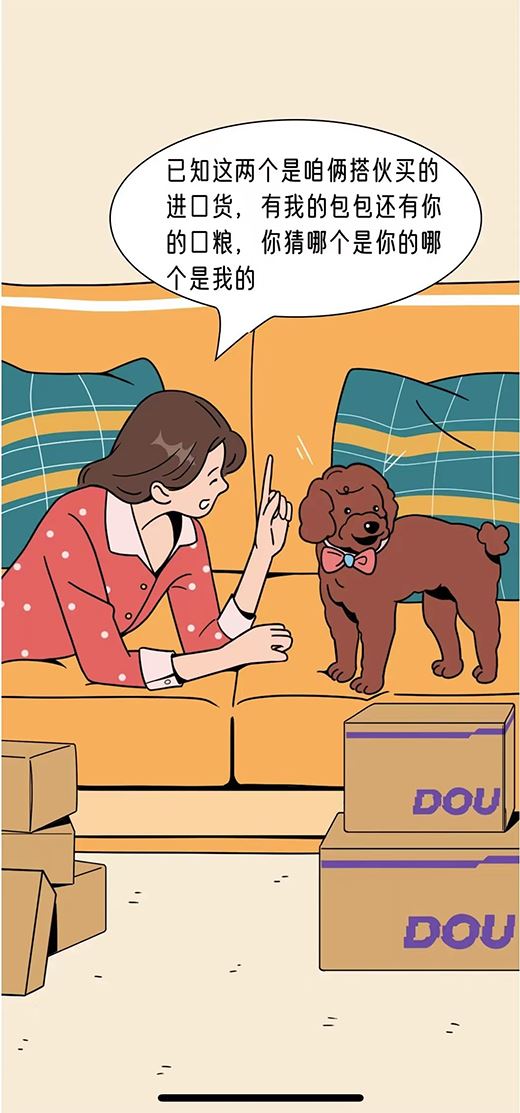 條漫以“查看TA的快遞”作為引入設(shè)置互動(dòng)環(huán)節(jié),召喚讀者通過點(diǎn)擊泡泡里的快遞盒,開啟主人公們的秘密故事。借助小小的快遞盒,條漫分別從時(shí)尚潮品、膳食營(yíng)養(yǎng)、母嬰玩具、美妝個(gè)護(hù)四個(gè)維度,講述了四段趣味橫生的小故事:可愛女孩與“愛狗”愉悅相處、新時(shí)代AI打工人熱衷養(yǎng)生、新手寶媽學(xué)習(xí)養(yǎng)娃、男性美妝領(lǐng)域博主搜羅全球好物。以上內(nèi)容生動(dòng)形象地展示了抖音電商全球購(gòu)的出現(xiàn),給用戶帶來了極大便利,讓每個(gè)人都能縱享趣生活。