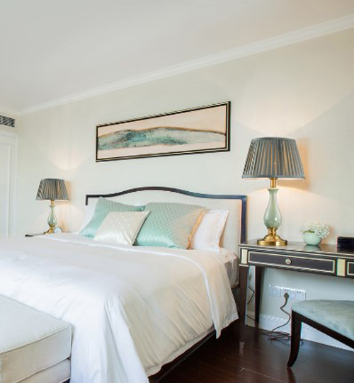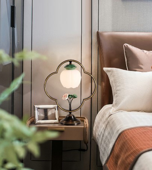 大明照明T090/01122臺燈,全銅外觀,輔以陶瓷蓮花荷葉的點綴,色澤亮麗,富有質感,盡顯古典大氣之美。將其放置于床頭柜上,和顏色與暖光相近的床上三件套相互輝映,一床一燈,和諧舒適。仿若只要我們躺在床上,閉上眼睛放松身心,便能聽到魚兒在水中暢游、在荷葉下嬉戲的輕微聲響,迷迷糊糊間竟也有了躺在池塘邊休息的錯覺。