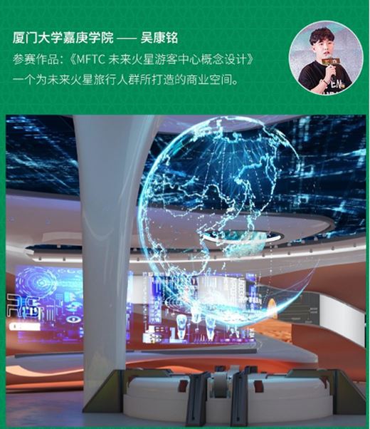 來自廈門大學嘉庚學院的吳康銘憑借作品《MFTC未來火星游客中心概念設計》贏得了總決賽學生組冠軍。該作品通過建筑的造型、空間功能、光的設計結合交互技術,完成一個完全屬于火星本土元素的建筑空間。