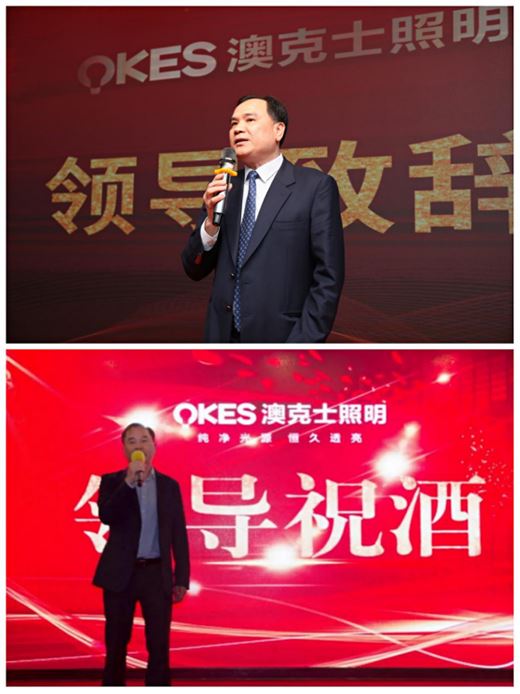 隨后,澳克士照明執行董事區沃鉅發表致辭,與所有人一起分享了公司的成立、起步和發展歷程,呼吁大家不忘初心,要始終保持對事業的堅持和熱愛,區總情真意切的講話引起了在場人員的共鳴和響應。致辭結束后,潘總、區總及嘉賓一同上臺祝酒,為今晚的相聚時光和未來展望舉杯同慶,共同祈愿大家在新的一年里能創造出更耀眼的輝煌。