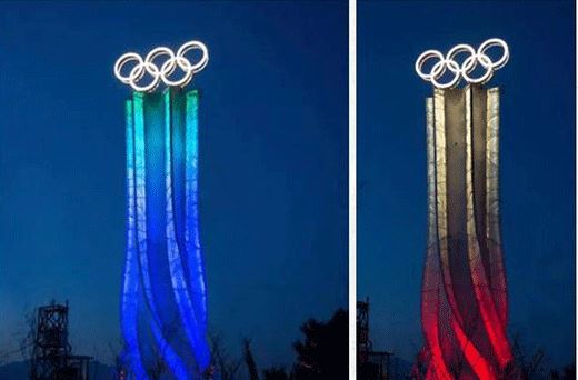 標志塔在原有塔身基礎上增添了裝飾設計和冬奧冰雪元素,雷士照明洗墻燈點亮塔身由上至下6條“冰晶飄帶”,為標志塔增添了冰雪魅力,讓“奧運五環標志塔”以最完美的姿態呈現出來。