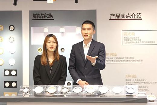 產品經理李土活和張倩瑜詳細介紹了鉑金多功能超薄筒燈及鉑金家族等筒燈產品。憑借超薄的燈體設計,鉑金多功能超薄筒燈早已成為熱銷產品,不僅能節省吊頂空間,輕松駕馭各種安裝場景,更采用寬開孔設計結構,科學地把常見的三個開孔安裝尺寸合并為一個尺寸,滿足一燈通用多個開孔尺寸,讓消費者裝修無憂。