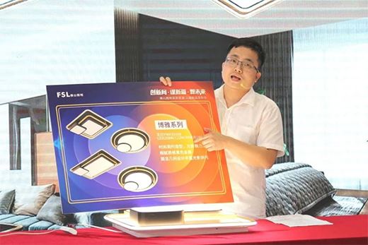 而第三位出場的產品經理馮成華則帶著鏡頭來到了花燈展示區,細致地展示了佛山照明裝飾花燈新品及其細節,經銷商們也紛紛咨詢相關產品細節。產品經理胡國強也帶來了近年熱門產品——集成吊頂,集成吊頂作為佛山照明近年新推出的產品,集吹風、照明、取暖、換氣等多功能于一體,成功打動了不少消費者。