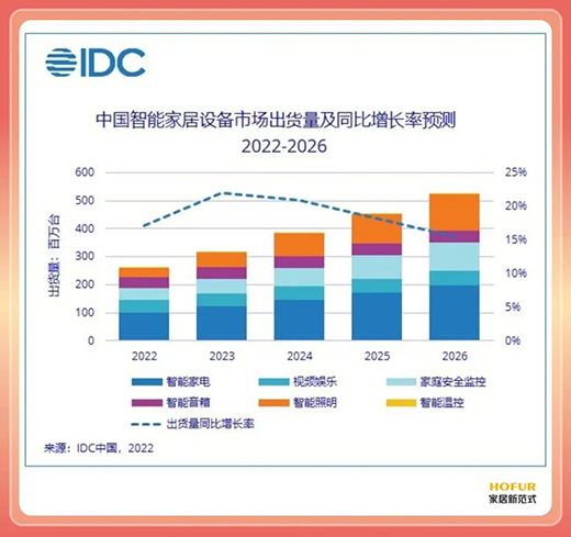 IDC預(yù)測,2023年之后,智能照明在智能家居中的規(guī)模占比將會逐步提高,預(yù)計到了2026年將有接近25%的規(guī)模占比。