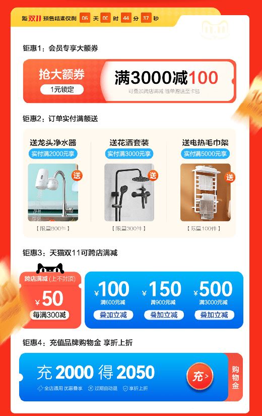歐普照明雙十一預熱活動則以“滿減”“滿送”為主。