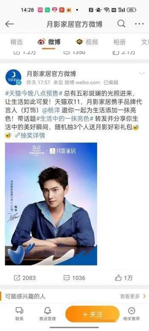 10月24日,月影家居在官方微博發出雙十一預熱活動,通過明星代言人楊洋,為品牌助力。