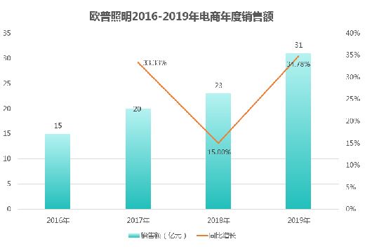 歐普照明是涉獵電商領域較早的照明企業,2013年電商年度銷售額已達到2.2億元,之后便一路長紅,2016年銷售額沖到15億元,2017年、2018、2019年分別為20億元、23億元、31億元。