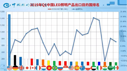 從2019年Q1中國LED照明產品出口目的國排名來看,其中美國作為我國照明產品出口的頭號市場的地位不可動搖,在各品類照明產品出口上幾乎都是位列榜首,但出口美國的相關廠商為應對貿易摩擦在2018年下半年有集中沖量的舉措,至2019年一季度美國市場尚處于消化庫存階段,因而同比有約為10%的下滑。